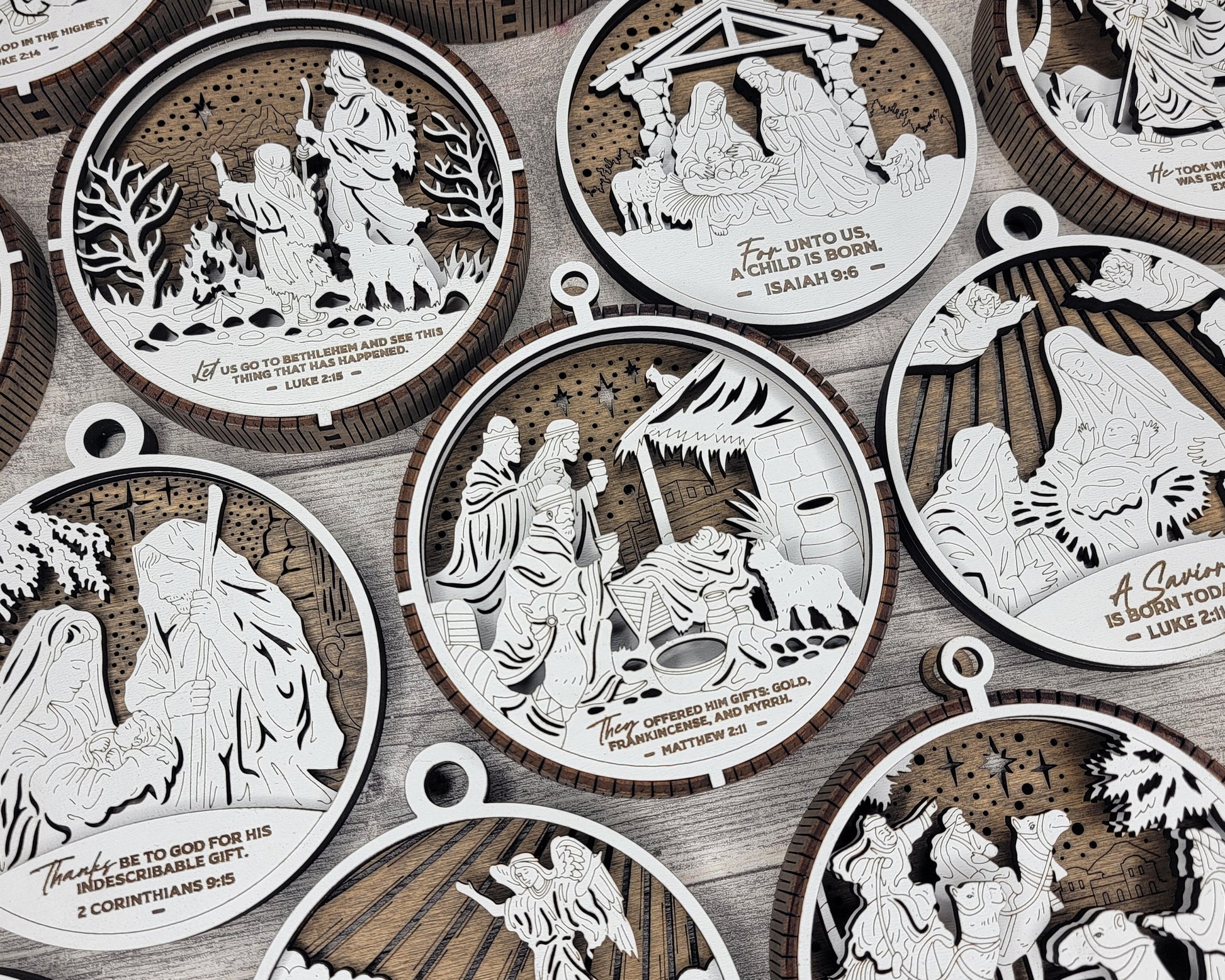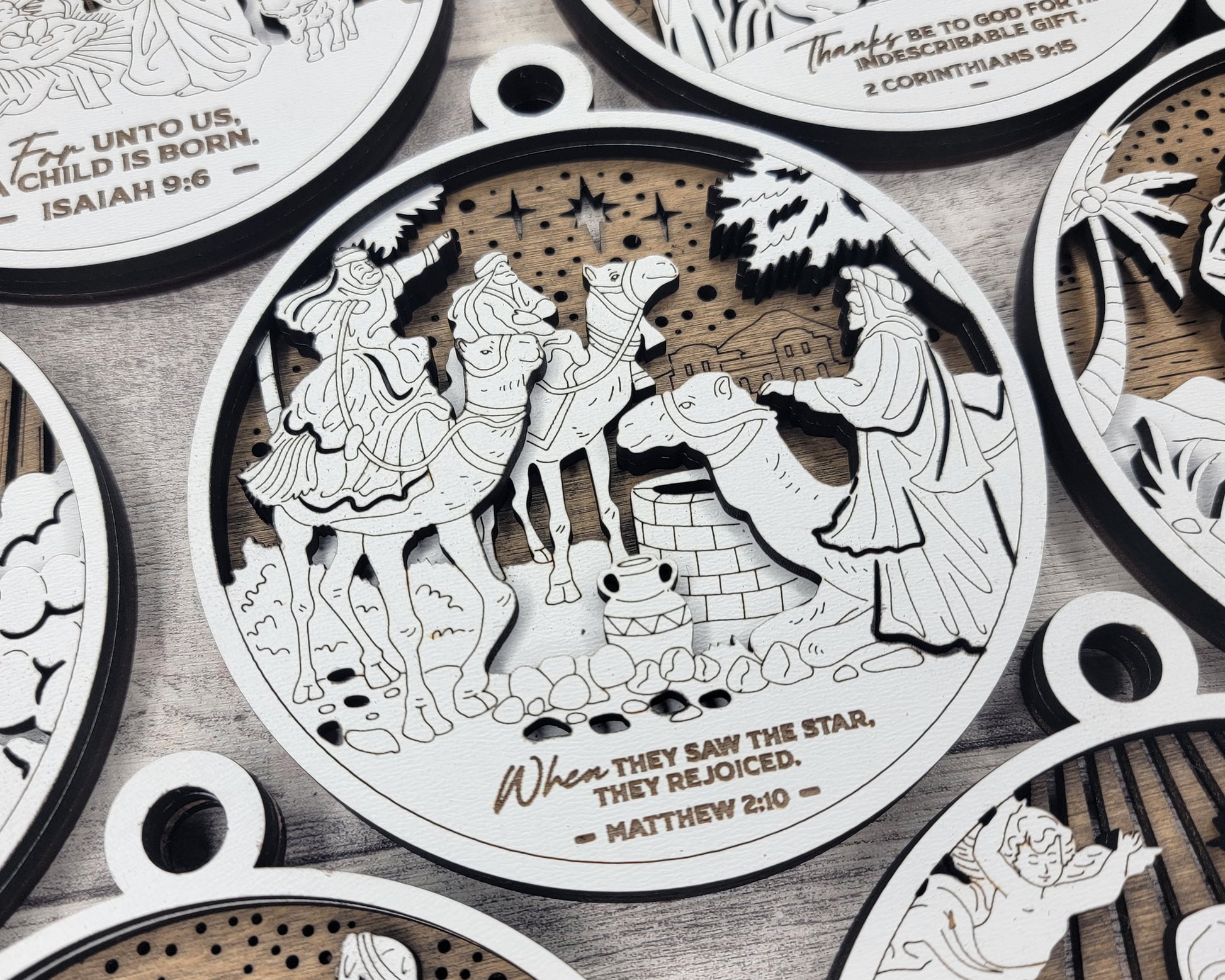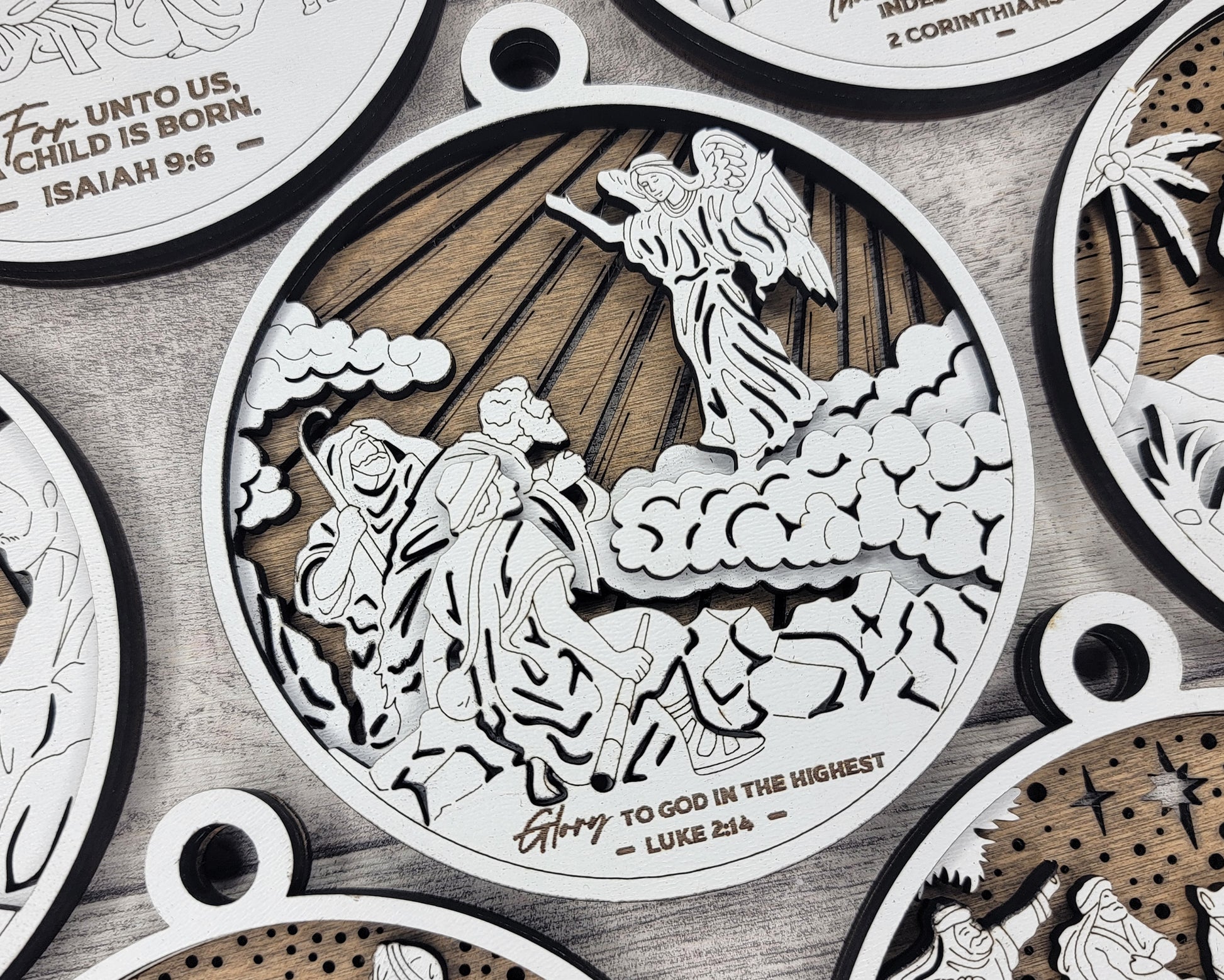 This meaningful collection includes eight beautifully crafted ornaments, each designed to gently remind us why we celebrate this season. Every piece features scripture that tells the story of Christ’s birth—verses like Matthew 2:11, Luke 2:5, and 2 Corinthians 9:5—inviting peace, reflection, and the joy of the Savior into your home.