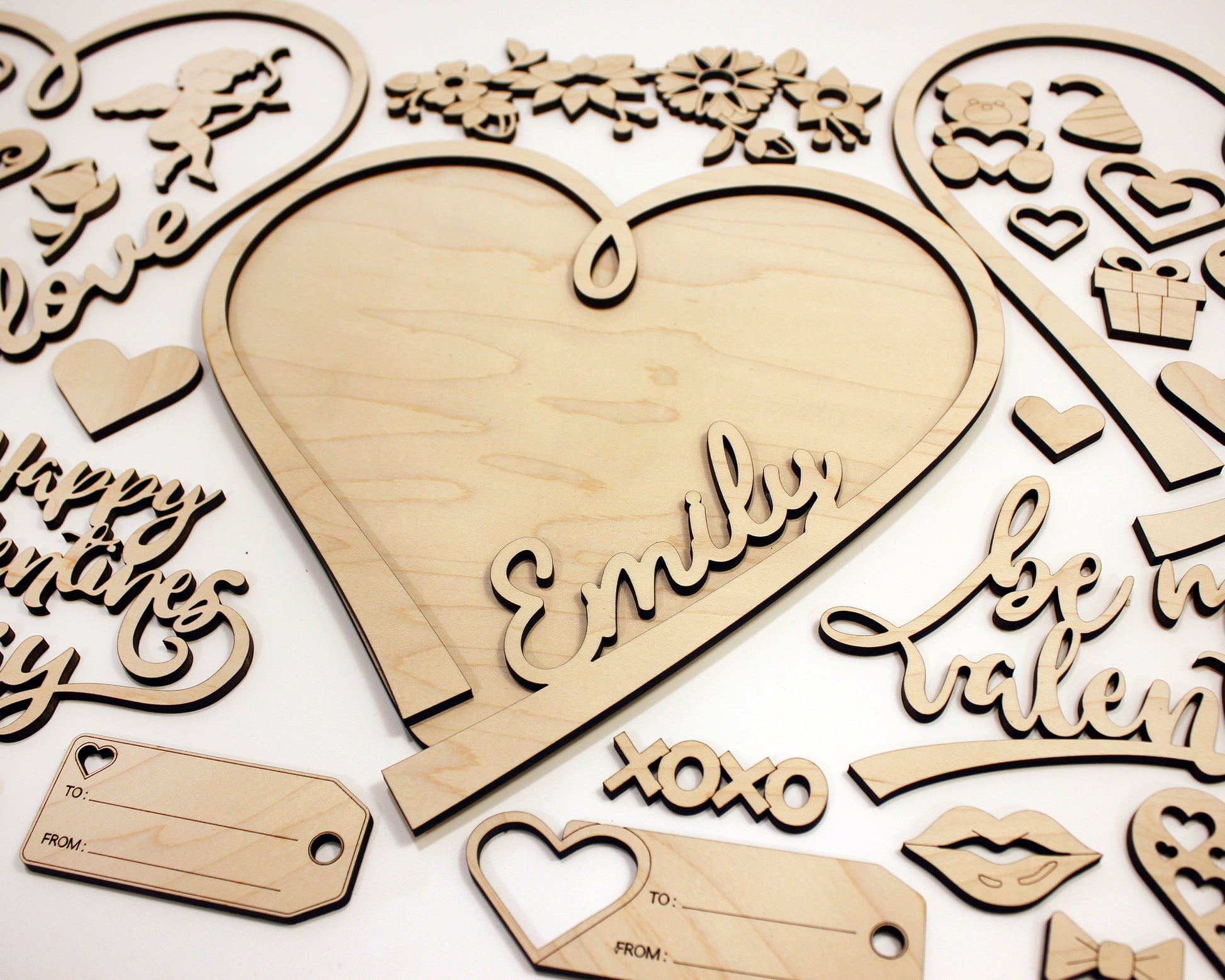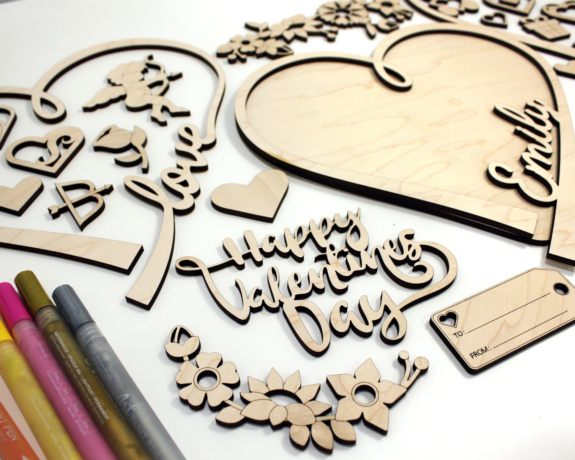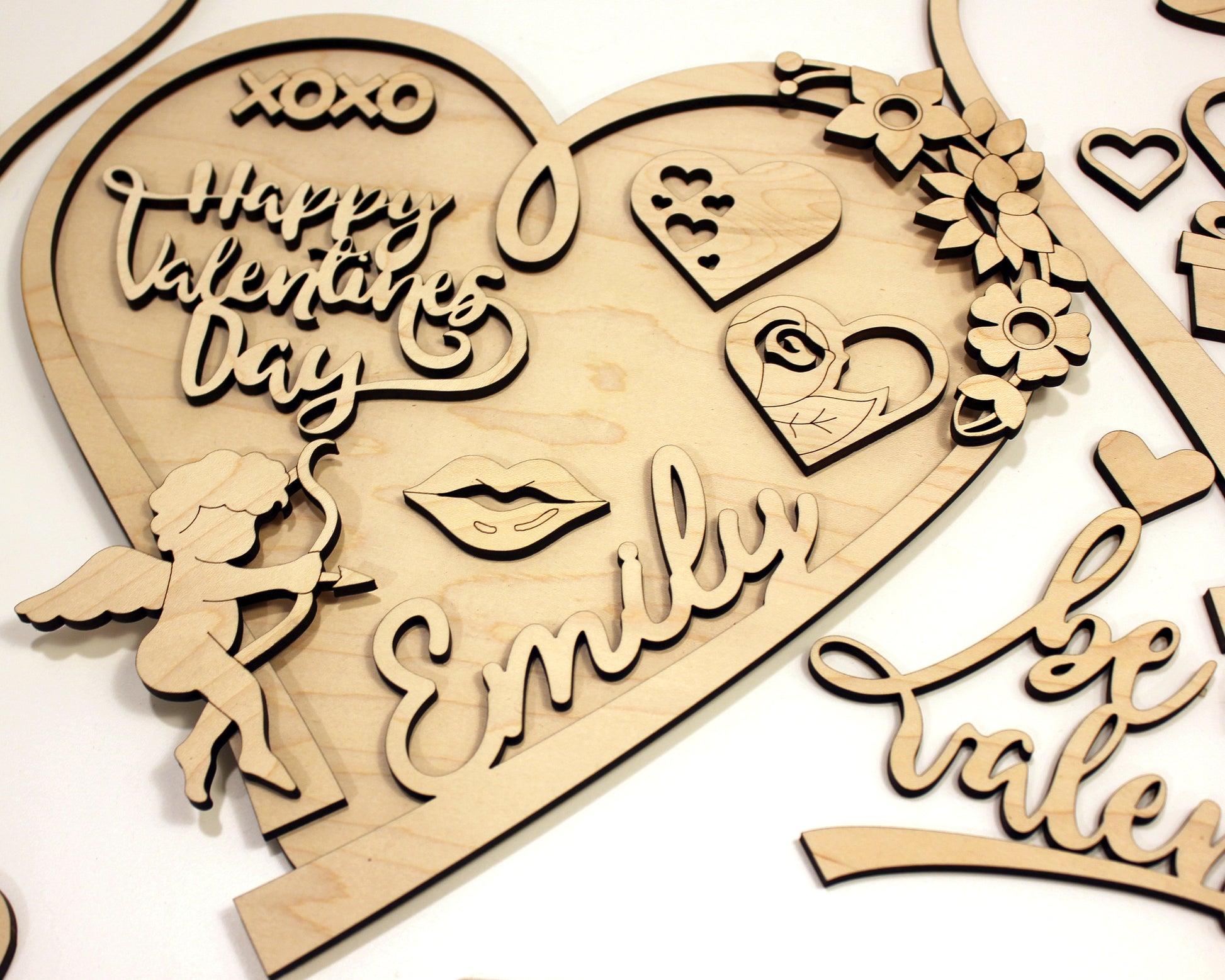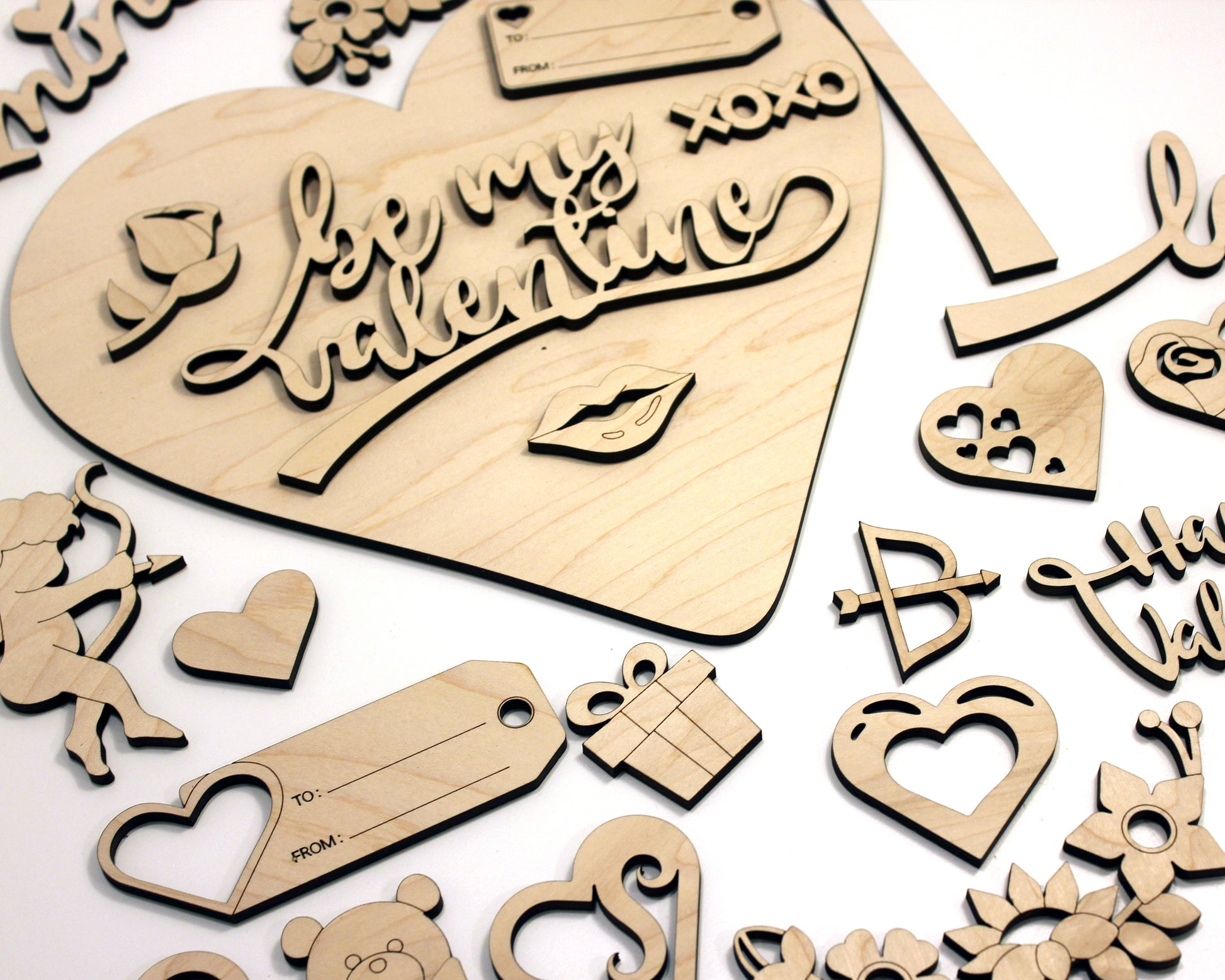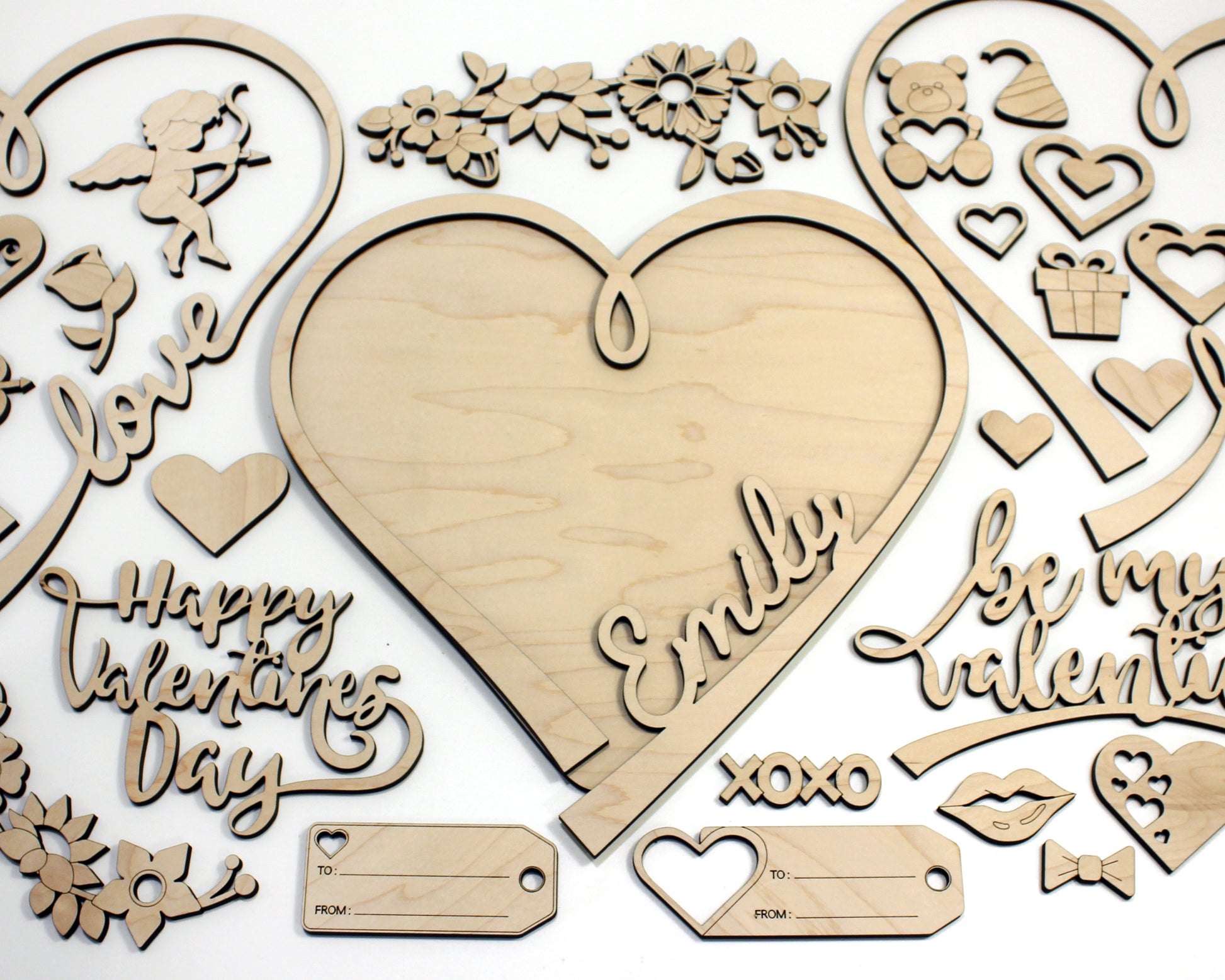 This is a unique build a heart DIY kit for Valentines day. The set includes over 25 unique valentines day icons, 2 heart backers and the option to customize a top layer heart with a special someones name. Our Valentines DIY set is crafted from wood and comes unfinished for you to paint and assemble as a craft for kids or adults.