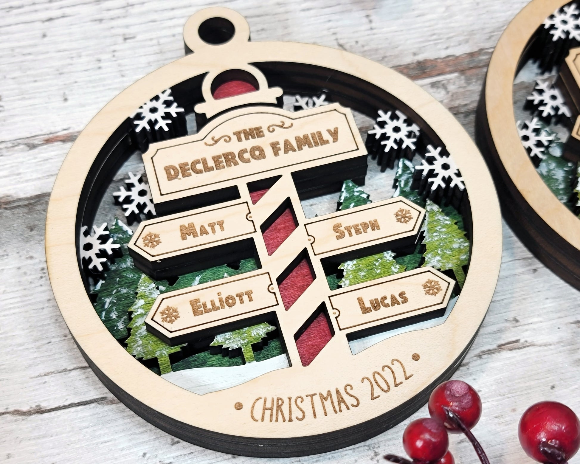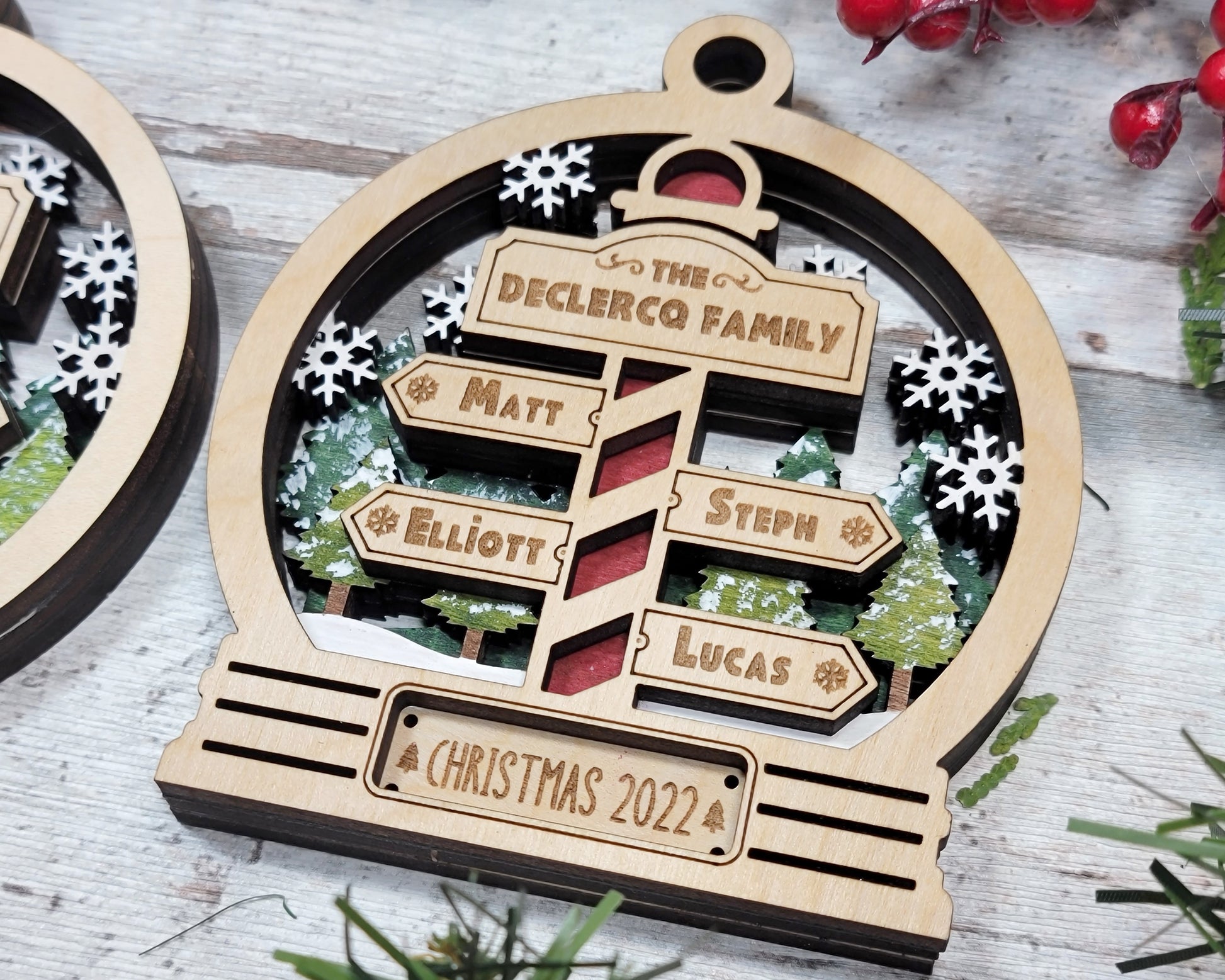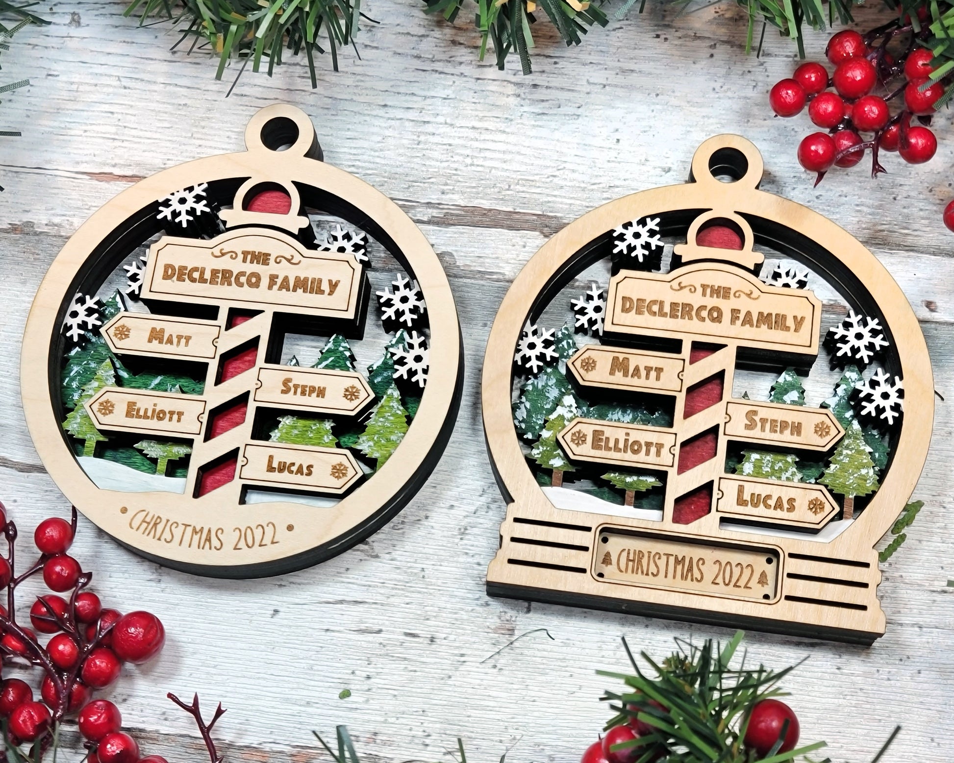 We are offering some incredible customizable ornaments and signage that are available in 2 different design options. Choose between our snow globe or round design and personalize with your family names. Our North Pole family products will be a great keepsake during Christmas for years to come. Our ornaments and signage are crafted from wood.