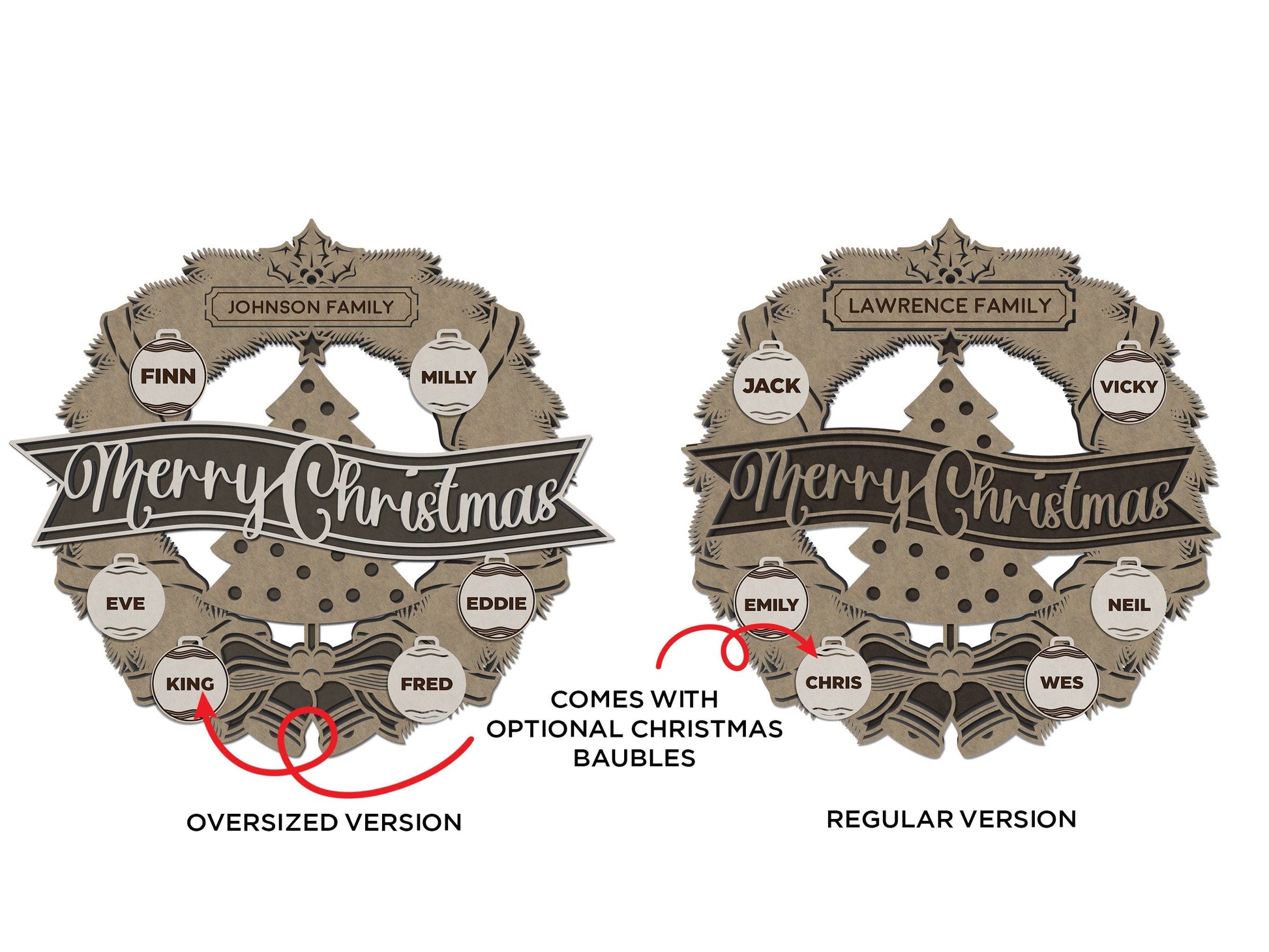 Our wreaths are crafted from quality wood and come in two sizes: the classic 10.5”x10.5” or the statement-making oversized 18”x18”. Add your family name or individual family member names for a personal touch. For extra cheer, we offer the option to add festive baubles, each customizable with names for every member of your family.