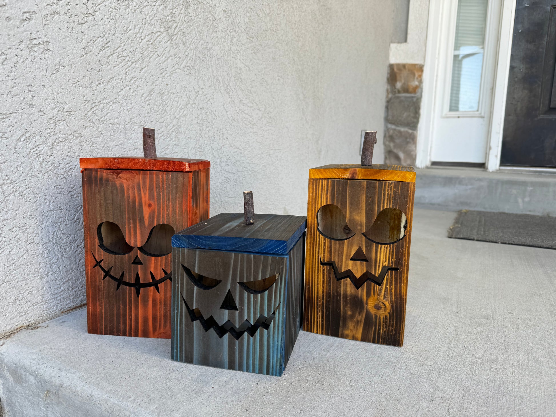 Made from cedar wood that has been burnt to bring out the grain and dyed a high contrasting color, these square pumpkins are sure to add fun and spooky to any halloween decor!